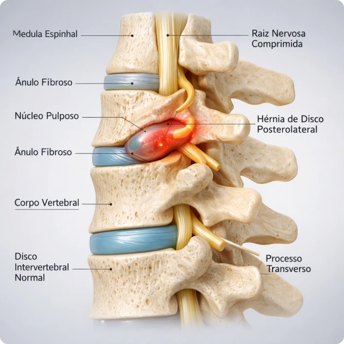 A hérnia de disco acontece quando o disco que fica entre as vértebras (aquele "amortecedor" da coluna) se desloca ou rompe, podendo comprimir nervos ao redor.