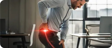 O canal por onde passam os nervos vai “apertando”. Isso pode causar dor nas costas ou nas pernas ao andar, e melhora quando você senta ou inclina o tronco para frente.